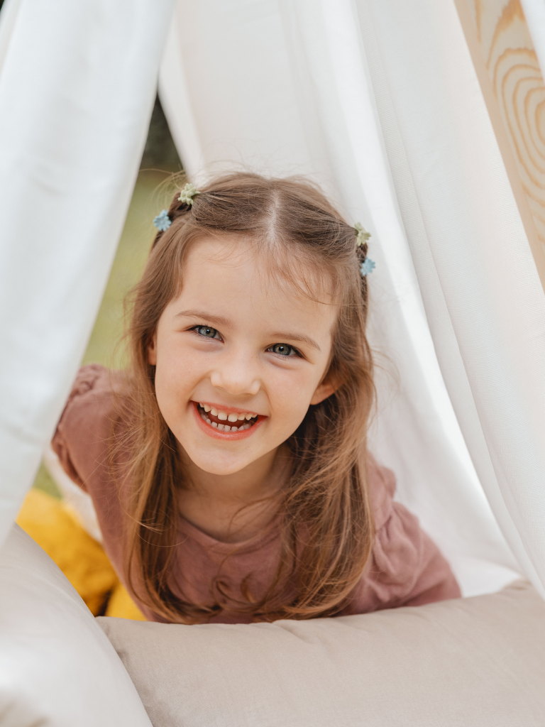 Am Fototag treffe ich frühzeitig in der Einrichtung ein. Idealerweise haben die Kinder zu diesem Zeitpunkt die Gelegenheit, mich bereits kennenzulernen. Während ich fotografiere, haben die Kinder die Möglichkeit, sich frei im Außengelände zu bewegen. Auf diese Weise sind sie ganz in ihrem Element und zeigen sich von ihrer authentischen Seite. Zusätzlich biete ich zwei selbst konzipierte Sets an: ein kuscheliges Tipi-Zelt und einen interaktiven Limonadenstand, in dem die Kinder sich fotografieren lassen können. Jedes Kind ist einzigartig, und so entstehen viele individuelle Bilder. Abschließend runden Gruppenaufnahmen den Fototermin ab. Das Nachmittagsprogramm wird im Anschluss wie gewohnt fortgesetzt, um den alltäglichen Rhythmus nicht weiter zu stören.