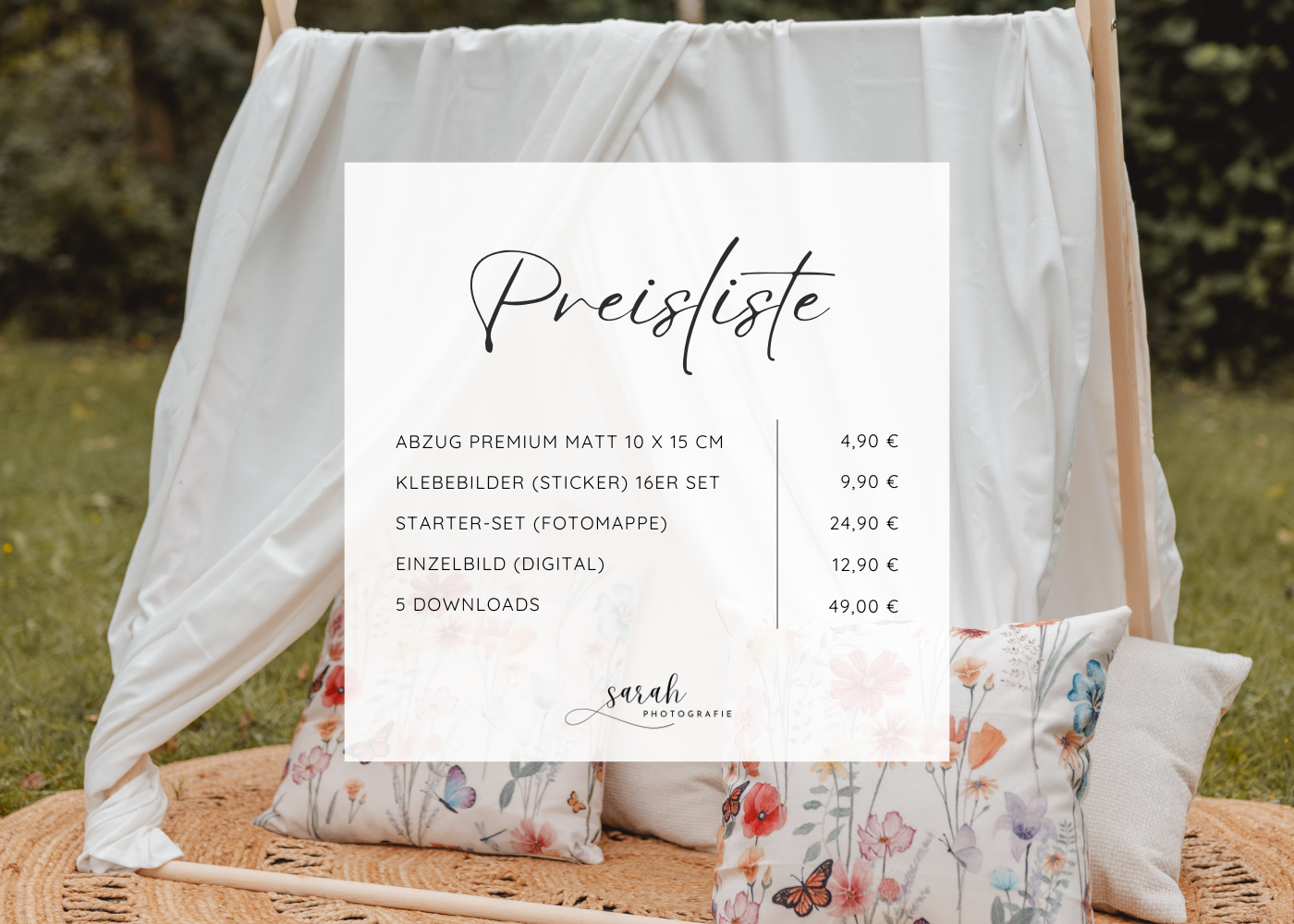 Hier findest du einen Auszug meiner Preise 2025 – die Übersicht ist vorbehaltlich und kann sich jederzeit ändern. Sie soll dir jedoch einen guten Ersteindruck meiner Leistungen und Preise geben.